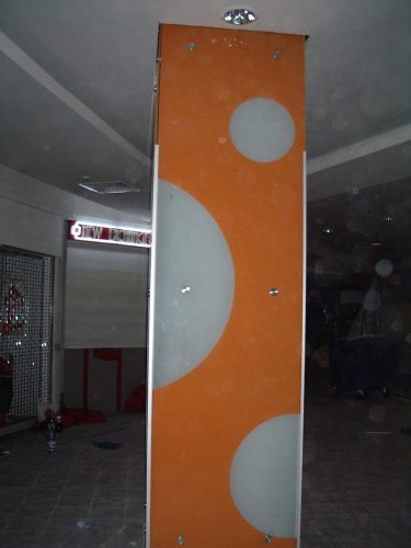 Pereții pot fi placați cu sticlă colorată de diverse grosimi, cu o gamă variată de culori. De asemenea, se pot creea imagini de efect prin prin imbinarea sticlei cu lumină.